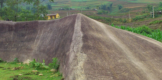 Những khối đá to nhỏ nằm rải rác xung quanh cái bãi đá này, nào là những phiếm đá nhỏ ẩn lấp dưới những bãi cỏ xanh rì, những hòn đá to khổng lồ dài 15m cao 4m thì nằm chễm chệ trên mặt đất. Trên những phiến đá trong bãi đá cổ còn sở hữu những hoa văn độc đáo, lạ mắt như ruộng bậc thang, hình người, nhà sàn, con đường hay chữ viết được chạm khắc rất rõ ràng. Nhưng có nhiều những tảng đá sa thạch, những hoa văn mông lung khó hiểu, những kí hiệu lạ vẫn chưa được tìm rõ nguồn gốc và không biết được ý nghĩa của nó; vừa gợi nên sự vật này cũng vừa khiến người ta liên tưởng đến những sự vật khác.